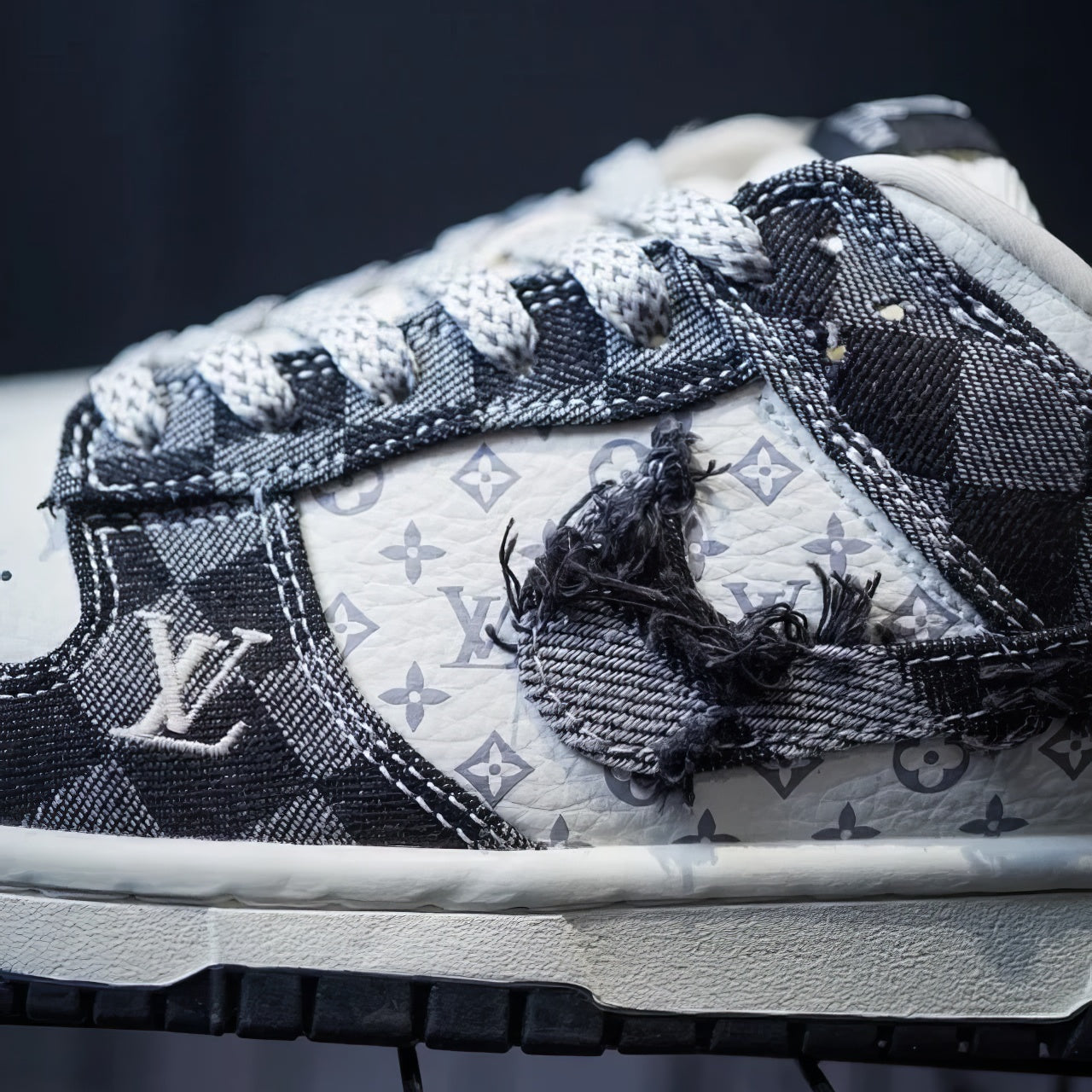 The upper features a black-and-grey checker pattern accented with Louis Vuitton–style monogram details, giving the sneakers a refined yet street-ready vibe. The swoosh and panels show handcrafted distressing and layered textures that make each pair unique.