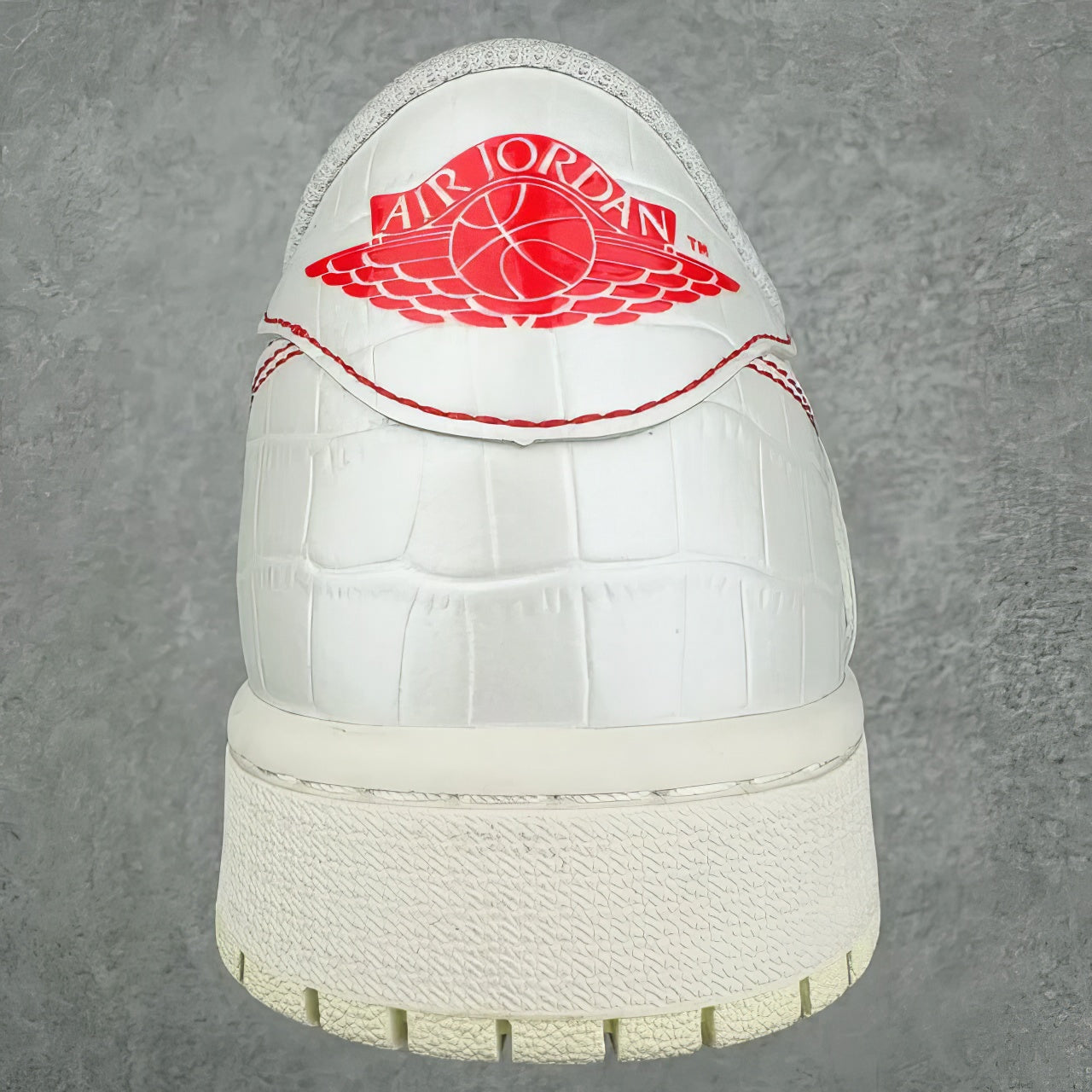 The upper features a white crocodile-style pattern with sharp red outline stitching, giving the sneakers a clean yet standout look. The reversed swoosh and panel lines highlight the signature Travis Scott aesthetic while keeping everything sleek and modern.